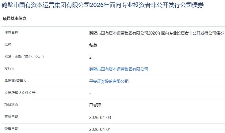 【大河财立方消息】4月3日,鹤壁市国有资本运营集团有限公司2026年面向专业投资者非公开发行公司债券项目获上交所受理。债券拟发行金额2亿元,承销商/管理人为平安证券。